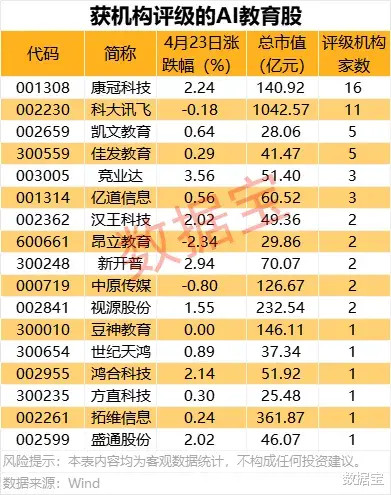 据证券时报·数据宝统计,A股中布局“AI+教育”的上市公司共有28家,4月23日有19股实现上涨,浙大网新涨幅居首,达到7.79%,竞业达上涨3.56%,康冠科技、鸿合科技等5股涨幅超2%。多只概念股今年以来实现大幅上涨,概念股平均涨幅达到4.97%,拓维信息、新开普累计上涨超50%。